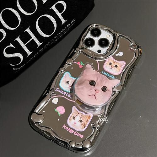 iPhone ケース カバー 韓国 メタリック シルバー 猫 アニマル 海外 おもしろ ウェーブ なみなみ 耐衝撃 カメラ保護 おしゃれ リング付き