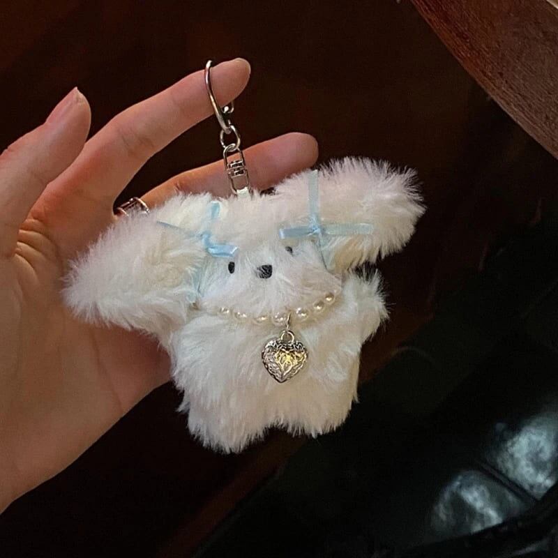 白いふわふわの体には、愛らしいリボンがついており、バッグや鍵、車のミラーなどに取り付けて、可愛らしさをプラスできます。