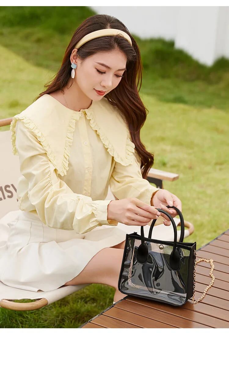 透明なPVC素材で、おしゃれでかわいい印象を演出。