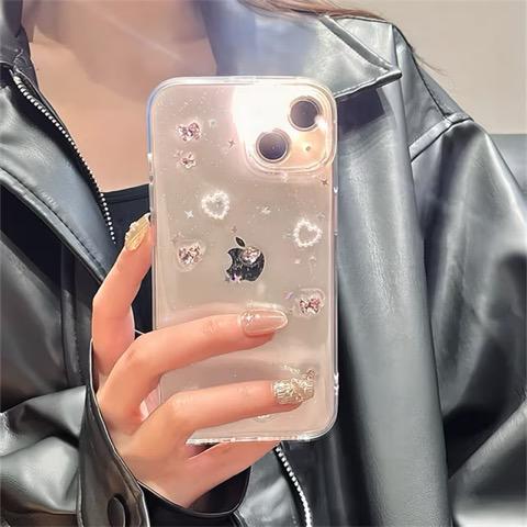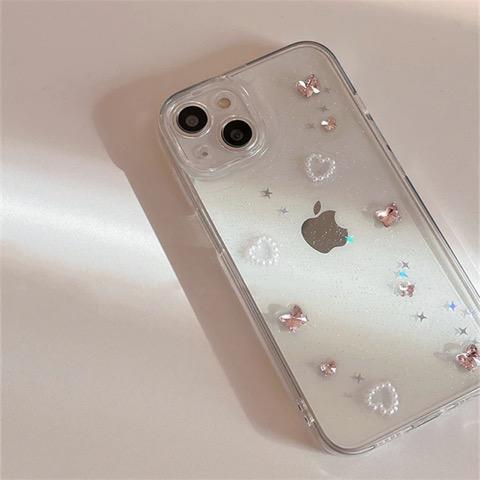 iPhone ケース 韓国 ハート パール 透明 クリア 黄ばまない 推し キラキラ ストーン 薄い 大人 xr 12 13 14 15 pro max