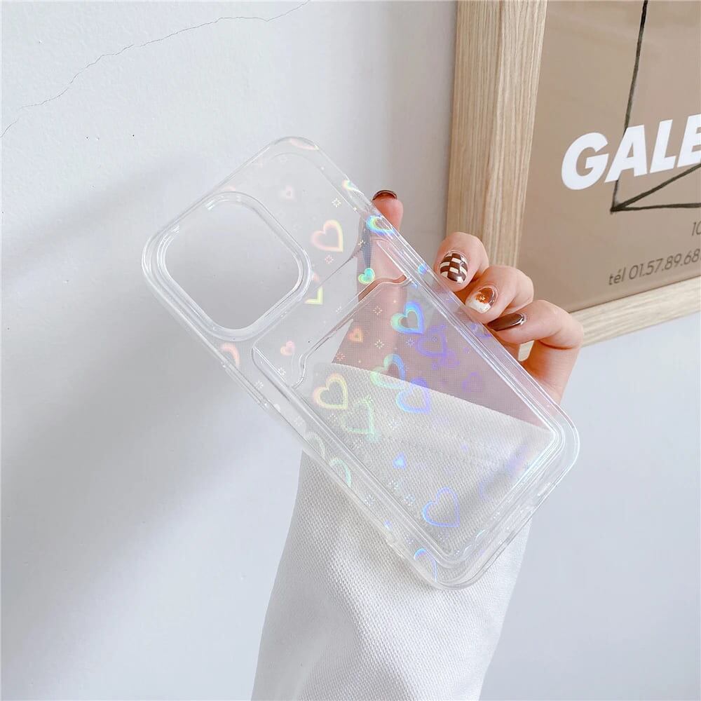 iPhone ケース 韓国 透明 ホログラム ハート キラキラ 背面収納 カード 推し活 シンプル 大人 かわいい xr 11 12 13 14 15