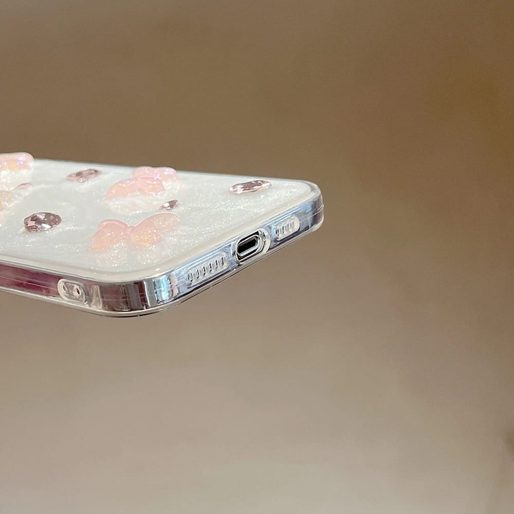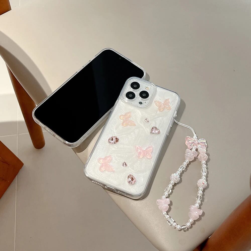 iPhone ケース 韓国 透明 蝶 バタフライ ストーン ハート かわいい ピンク ストラップ付き チャーム リボン se xr xs 11 13 15