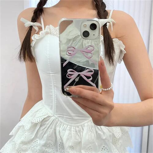 iPhoneケース 韓国 背面 ミラー 鏡 ピンク リボン かわいい カバー スマホ 量産型 トレンド おしゃれ 大人かわいい ネクタイ レトロ Y2K 15 14 13 Plus 耐衝撃 ハード 割れにくい 可愛い フレンチガーリー シンプル