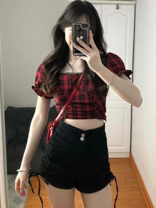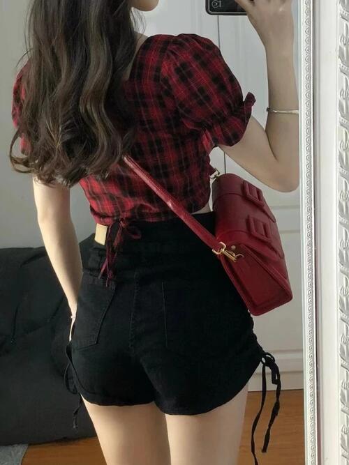 【送料無料】スクエアネック レッドチェック パフスリブラウス 半袖 トップス チェッカーTシャツ ショート クロップド丈 リボン レディース ロック パンク クラシカル シック 大人 かわいい おしゃれ イベント コンサート アイドル セクシー ワンホン 韓国 Y2K 赤 黒 春夏
