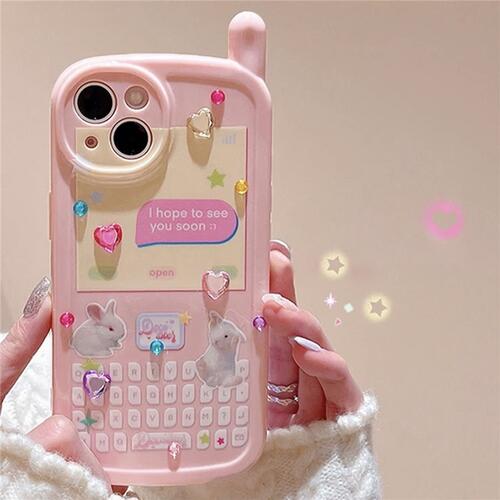 【iPhone用ケース】レトロガラケー風 iPhoneケース うさぎ ピンク ハート かわいい ビジュー きらきら Y2K 地雷系 量産型 シリコンカバー iPhoneカバー 衝撃耐性 韓国 割れにくい お洒落 フレーム保護 ワンホン トレンド 人気 送料無料 電話 キュート