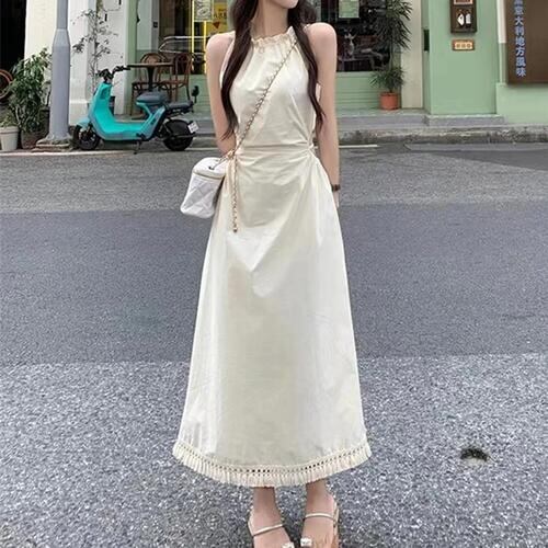 レディース ロング ワンピース ノースリーブ 春夏 夏用 マキシワンピース きれいめ 大きいサイズ S M L XL 白 黒 かわいい おしゃれ リゾート バックオープン セクシー 着痩せ カジュアル シフォン 大人可愛い 韓国 海外 大きめ リボン 上品 ハイネック フリンジ