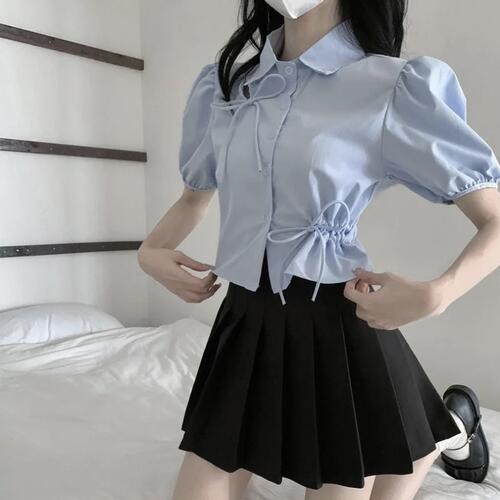 【送料無料】パフスリーブリボンブラウス 半袖 ショート丈 クロップド 襟付き 夏服 ライトブルーシック Y2K フレンチガーリー クラシカル かわいい おしゃれ 夏服 ストレッチ性 シズニルック ライブ コンサート イベント 韓国 スリムフィット 学生 オフィスカジュアル