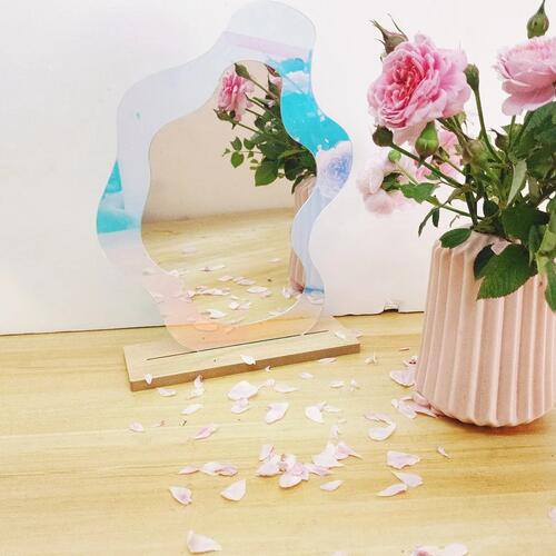 卓上 アクリル オーロラ ミラー 鏡 ウェーブ うねうね 韓国 北欧 軽量 インテリア かわいい おしゃれ お洒落 新生活 リビング 寝室 レインボー 壁掛け ウォール アーチ形 アンティーク 軽量 キャビネット 27cm 大きい 洗面所 大型 軽い 賃貸 薄い 木枠 姿見