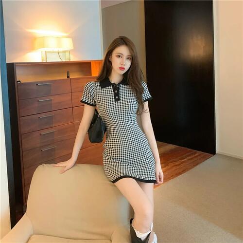 千鳥柄 ニット ミニワンピース 半袖 ミニドレス シャツワンピ ブラック ピンク エレガント レディース クラシカル シック 大人 かわいい お洒落 おしゃれ レトロ 推し活 春 夏 ワンホン サマードレス 韓国 旅行 ゴルフウェア Y2K ストレッチ素材