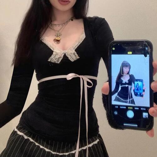 【送料無料】レースネック モノトーンカットソー リボン シズニルック Y2K ロングTシャツ ブラウス トップス セクシー リボン 韓国 ワンホン バイカラー かわいい フレンチガーリー レトロ 痩せ見え カジュアル 推し活