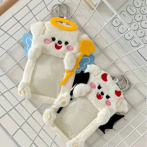 トレカ ケース 天使 悪魔 韓国 犬 いぬ アニマル 動物 ぬいぐるみ ふわふわ もこもこ かわいい おしゃれ 白 推し活 アイドル チェキ カード パスケース キーホルダー 保護 スリーブ付き リフィル チャーム ペンミ ファンミ ライブ イベント