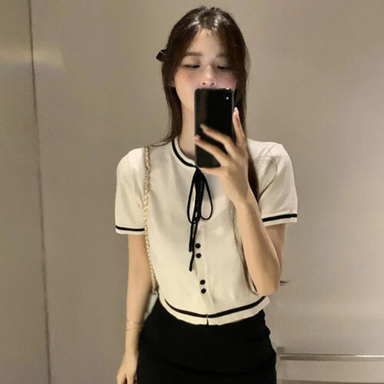 レディース バイカラー 半袖 カーディガン 夏 春 かわいい おしゃれ リボン サマーニット 韓国 黒 白 ショート丈 クロップド オフィス レトロ カジュアル 通勤服 薄手 シンプル ボタン