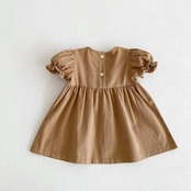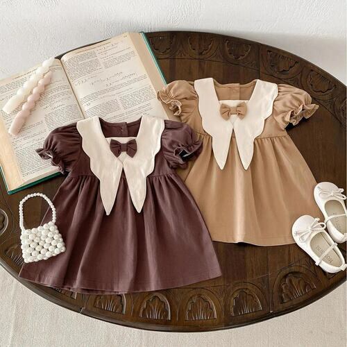 キッズ ビッグカラー ワンピース 半袖 夏 可愛い 女の子 秋 リボン ブラウン 茶色 レトロ 韓国 フォーマル 発表会 お呼ばれ 襟取り外し可能 90 110 おしゃれ フレア シルエット プリンセス ピアノ きれいめ