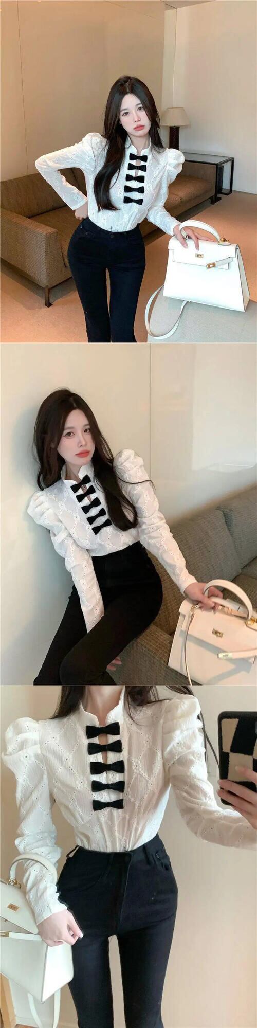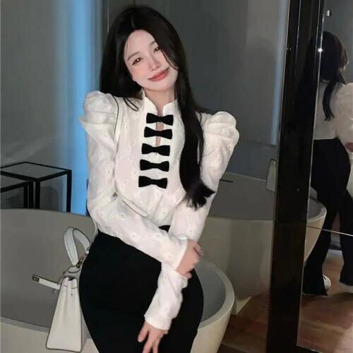 レディース 長袖 フレンチ ブラウス カットソー リボン レース かわいい パワショル チャイナ 中華 ワンホン 韓国 おしゃれ 白 黒 ベージュ 春 秋冬 大きいサイズ 立ち襟 クラシカル お呼ばれ カジュアル シフォン レトロ Y2K スリム