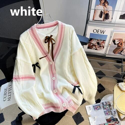 カーディガン レディース 長袖 秋冬 セーター ニット ゆったり かわいい 韓国 プレッピー もこもこ リボン Vネック ボタン ロング おしゃれ 厚手 暖かい ピンク 白 茶色 レトロ Y2K グランジ 大きいサイズ