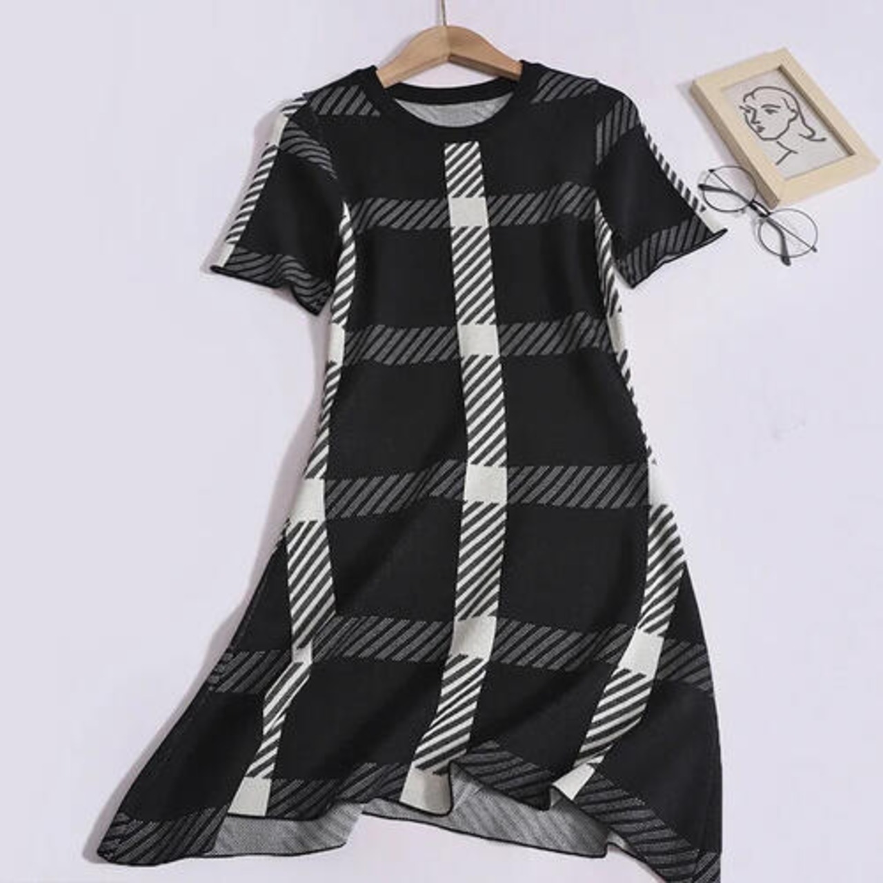 レディース ミニ ニット ワンピース チェック 韓国 ひざ丈 春 夏 秋 半袖 かわいい おしゃれ きれいめ カジュアル 黒 モノトーン シンプル Uネック 華奢見え ワンホン キャバクラ ラウンジ お呼ばれ ラウンドネック 上品 エレガント