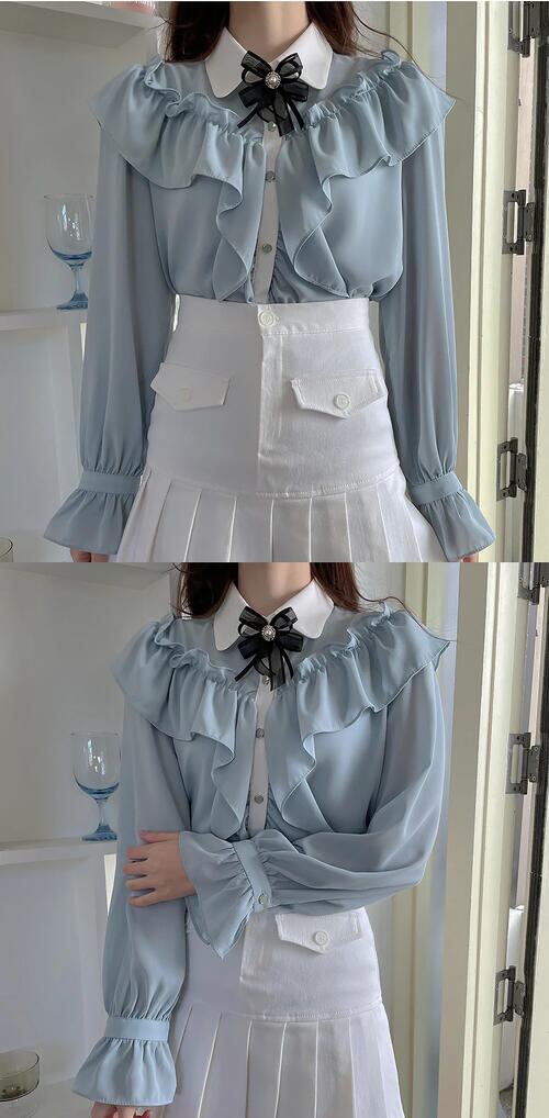 レディース 長袖 ラッフルフリル ブラウス 韓国 地雷系 量産型 かわいい おしゃれ 春 秋 ピンク 青 襟付き リボン ビジュー シフォン 大きいサイズ スリーブ