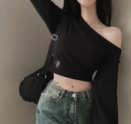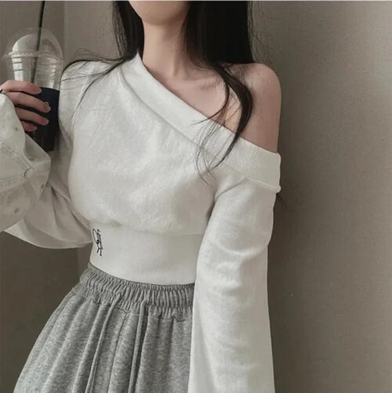 レディース ワンショルダー トップス スウェット 肩出し ワンショル 韓国 おしゃれ かわいい セクシー 春 秋 ランタンスリーブ ストリート レトロ ギャル Y2K ショート丈 クロップド へそ出し カジュアル ワンホン ワンポイント 刺繍