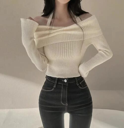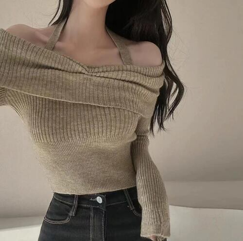 レディース オフショルダー トップス カットソー ニット カシュクール 痩せ見え クロップド ショート丈 肩出し リボン カーキ 黒 白 かわいい おしゃれ セクシー カジュアル ギャル Y2K 秋 冬 韓国