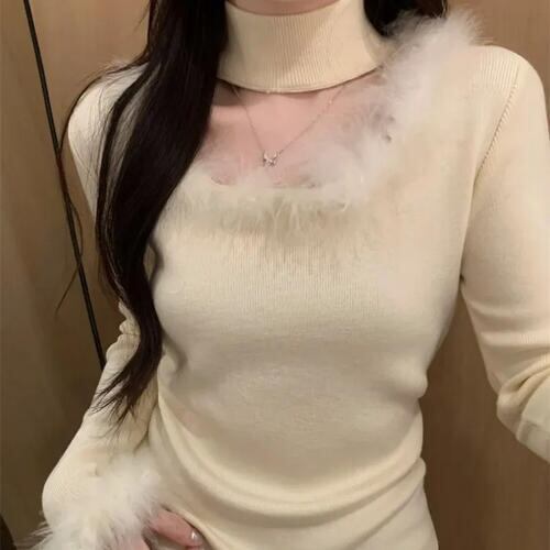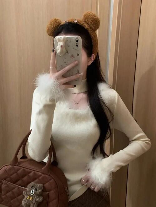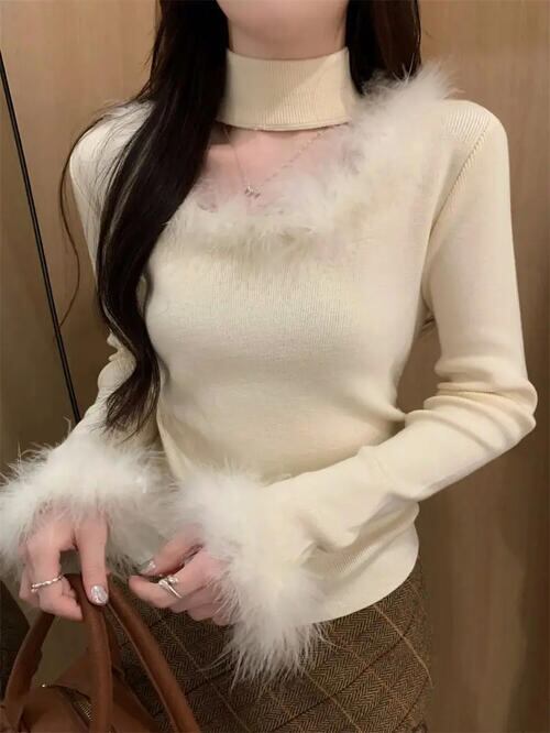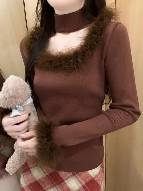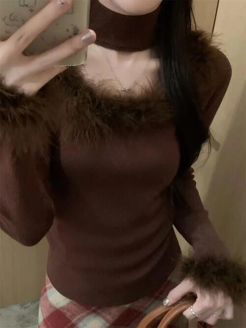レディース スクエアネック ファー ボア ニット トップス 長袖 チョーカー タートルネック かわいい ベージュ 茶色 韓国 レトロ Y2K おしゃれ グランジ 薄手 秋 冬 大きいサイズ ショート丈 クロップド 華奢見え 生地 きれいめ ふわふわ チョーカー