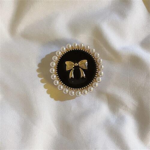 このスマホグリップは、レトロ感漂うリボンモチーフと、キラキラ輝くパールが特徴です。