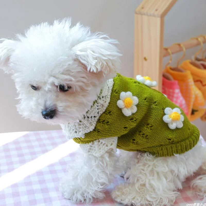 犬 服 セーター ベスト 花柄 かわいい ピンク 緑 おしゃれ 暖かい 手編み レース 防寒 散歩 小型犬 中型犬 クロシェ もこもこ ダックス コーギー
