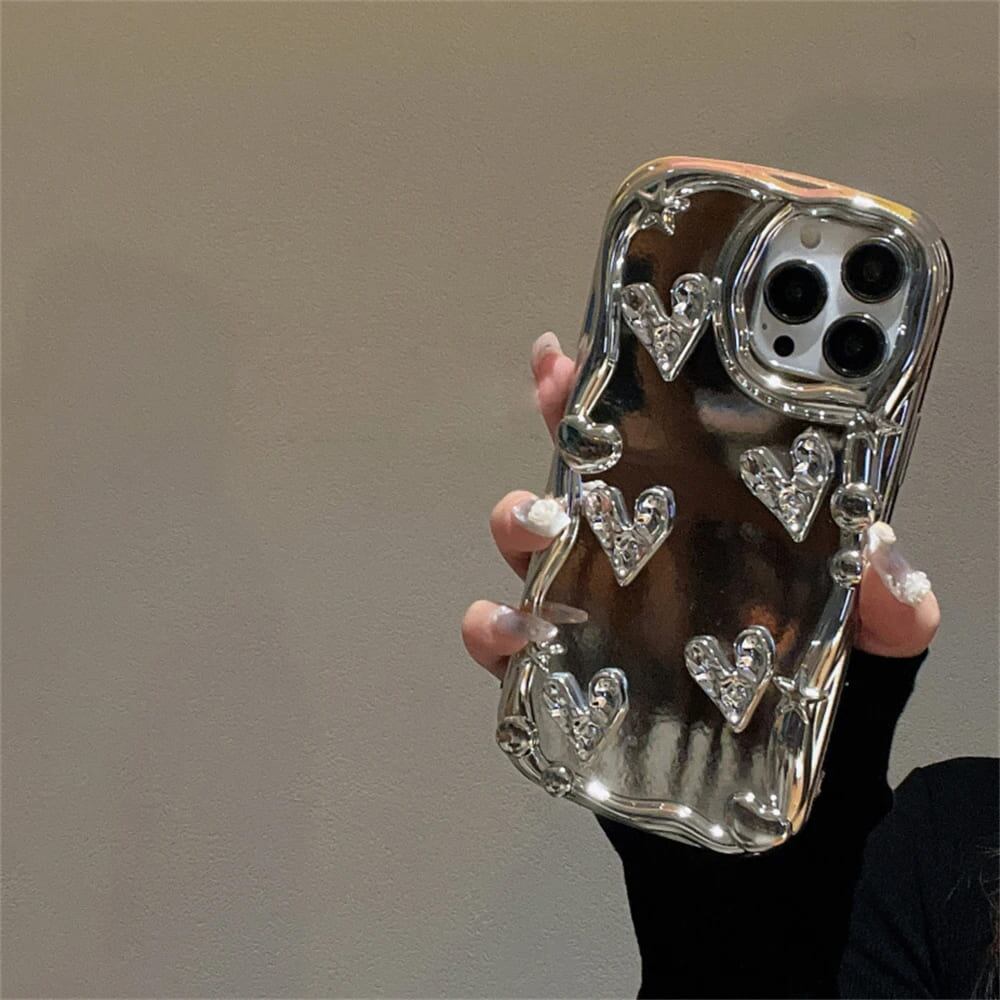 iPhone ケース カバー 13 14 Pro ハート 3D シルバー キラキラ おしゃれ かわいい 個性的 韓国 メタリック メッキ うねうね ウェーブ 耐衝撃