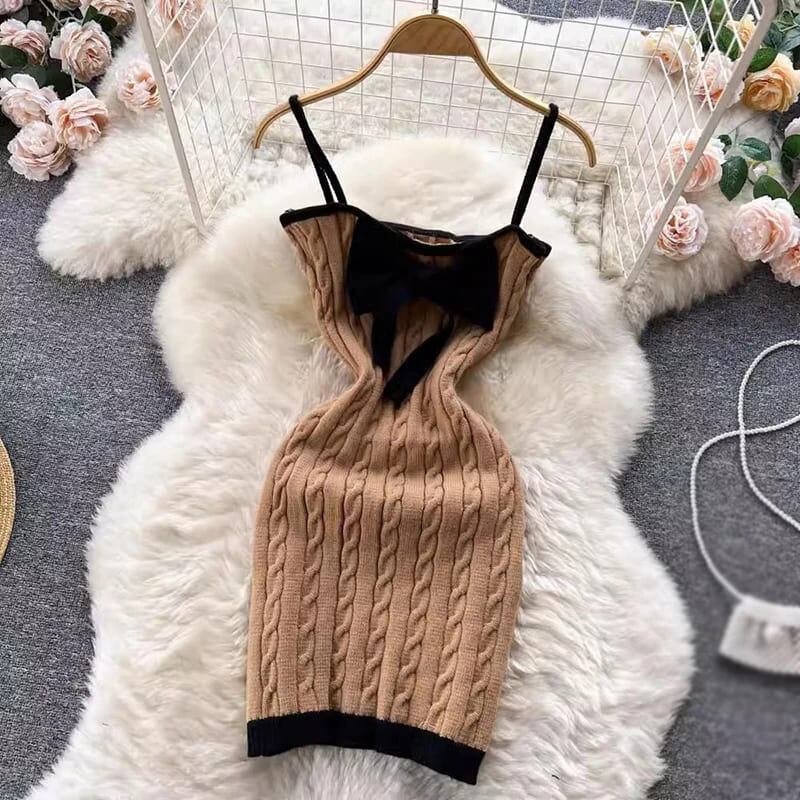 レディース キャミソール ワンピース ノースリーブ ミニ 韓国 ブラウン 茶色 ニット セーター リブ リボン かわいい レイヤード Y2K グランジ 秋冬 セクシー