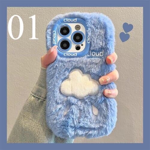このiPhoneケースは、愛らしいぬいぐるみのようなふわふわな質感が特徴で、雲やハートのキュートなデザインが目を引きます。