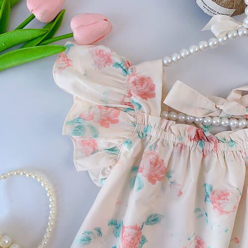 子ども服 女の子 キッズ 夏服 ワンピース ドレス ノースリーブ フリル ギャザー かわいい 花柄 バラ ピンク エレガント リボン 大人っぽい 3歳 7歳