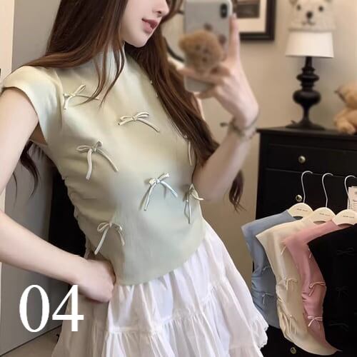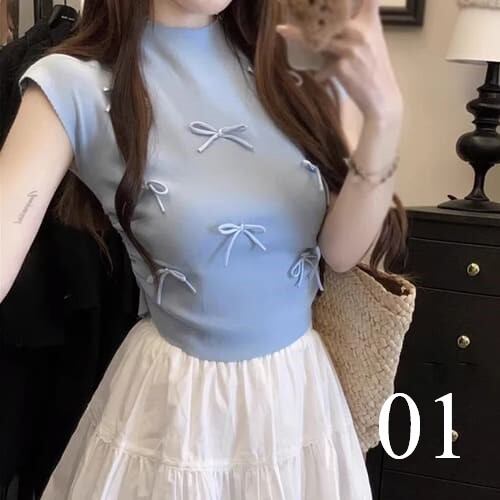 レディース 夏服 半袖 Tシャツ リボン フレンチスリーブ タートルネック サマーニット ショート丈 かわいい ガーリー オフィスカジュアル シンプル