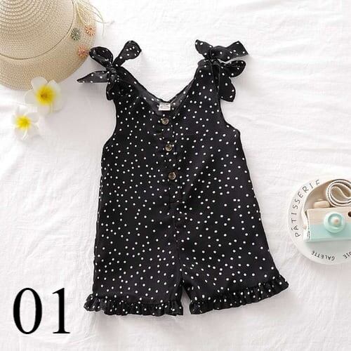 子ども服 女の子 キッズ 夏服 半袖 オールインワン オーバーオール サロペット ドット 水玉 ノースリーブ リボン フリル 大人っぽい 白 黒 前ボタン