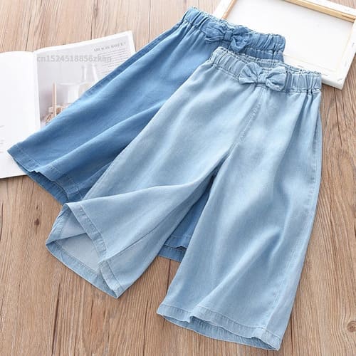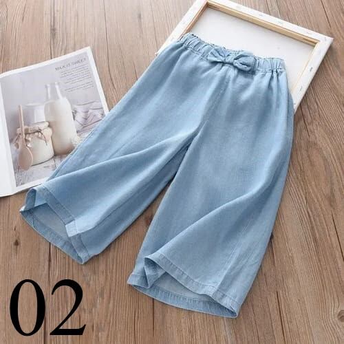 子ども服 女の子 キッズ 夏服 ワイドパンツ 長ズボン 薄手 涼しい ブルー 水色 さわやか リボン かわいい ウエストゴム ゆったり 小学生 160サイズ