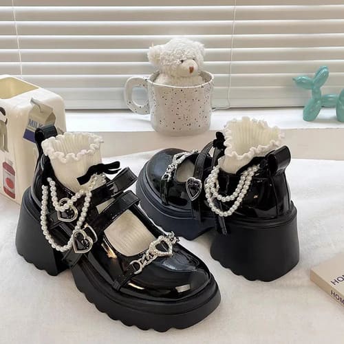 パンプス レディース 靴 大人 ストラップ 厚底 ヒール 黒 ハート バックル エナメル かわいい パール ゴスロリ ロリータ チャンキーヒール ゴツめ 量産 地雷