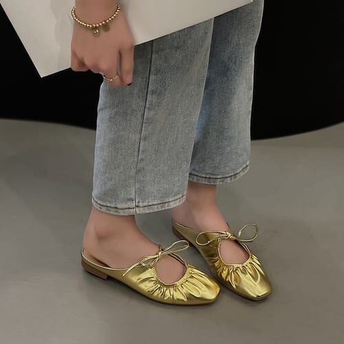メタリック×リボンがおしゃれ♪柔らかくて歩きやすいフラットパンプス