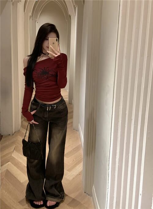 レディース トップス 長袖 Tシャツ 韓国 クロップド 赤 ゴシック パンク カジュアル オフショルダー 肩出し おしゃれ かっこいい カットソー グランジ Y2K