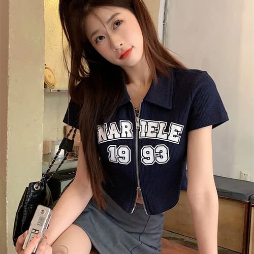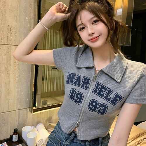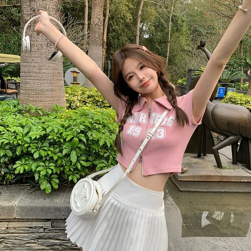 レディース トップス Tシャツ 夏 韓国 半袖 ジッパー レトロ Y2K プリント おしゃれ かわいい 襟 ストリート ショート丈 レイヤード カットソー ピンク
