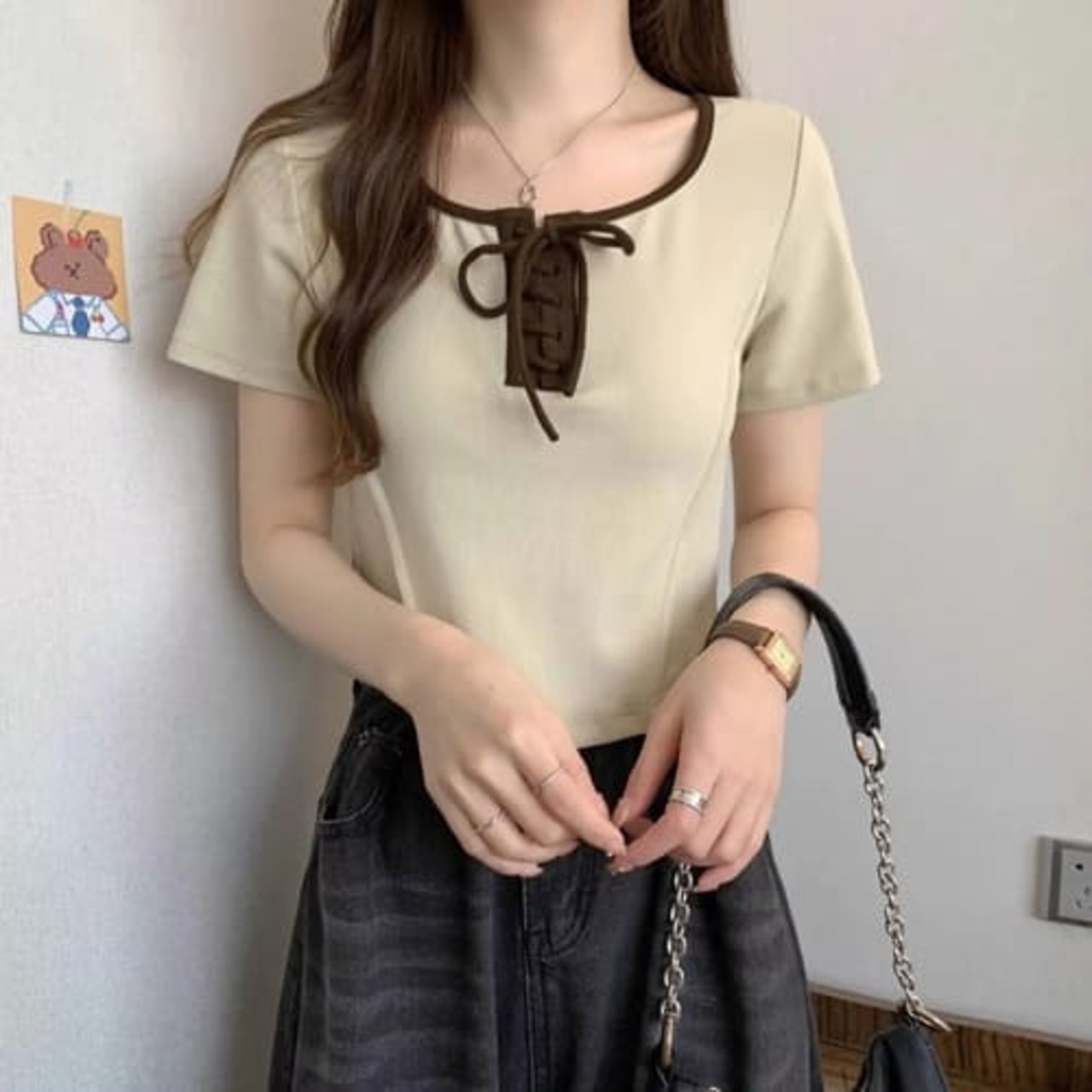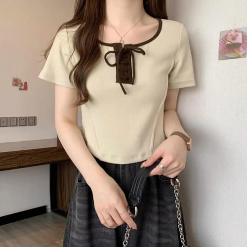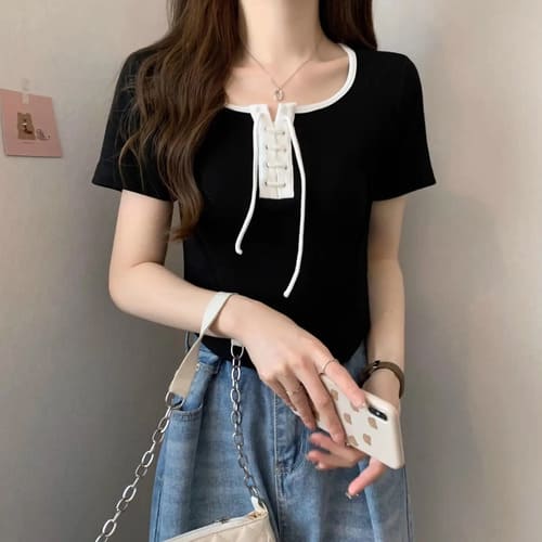レディース トップス 半袖 スクエアネック カットソー Tシャツ 韓国 春夏 カジュアル リボン おしゃれ かわいい レースアップ レトロ Y2K 黒 白 ベージュ