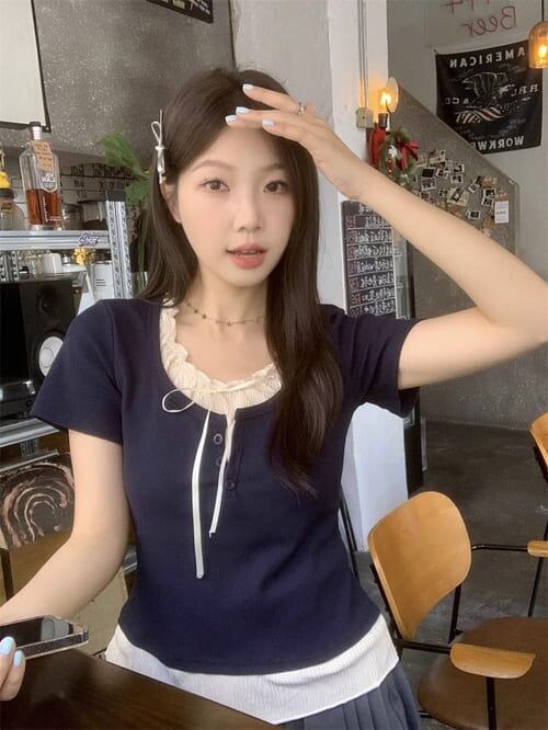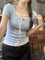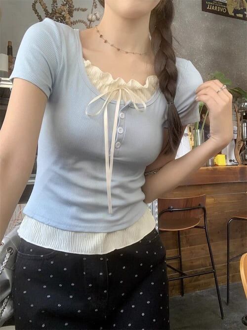 レディース トップス ラウンドネック Tシャツ 半袖 フリル 韓国 リボン ボタン カットソー かわいい おしゃれ クロップド バレエコア 春夏 黒 水色 レイヤード