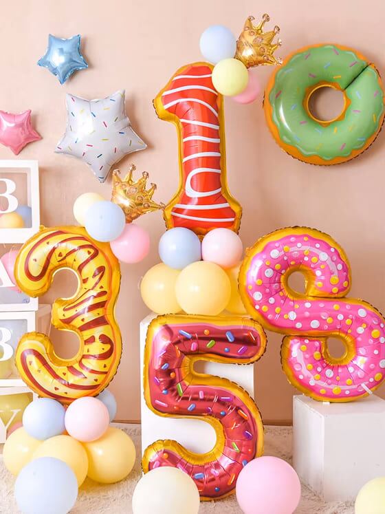 大きな数字とドーナツデザインで甘くおしゃれに演出!特別な日を彩るスイーツバルーンで、パーティーを盛り上げよう